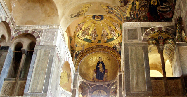 Monasterio Hosios Lucas s. XI. Distribución jerarquizada de los temas iconográficos; en la Cúpula Pentecostés; en la boveda de horno la Virgen entronizada con el niño;