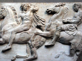 FIDIAS. Realiza él o sus discípulos los relieves del Partenón : frontones y metopas; y el friso de las Panateneas de la naos. Aporta: mejora el tratamiento anatómico masculino y en el femenino por la técnica pliegues de los paños mojados, que pegados al cuerpo traslucen su anatomía. acentuando su naturalidad y ritmo; la tendencia a la individualización de los rostros y relación entre los personajes